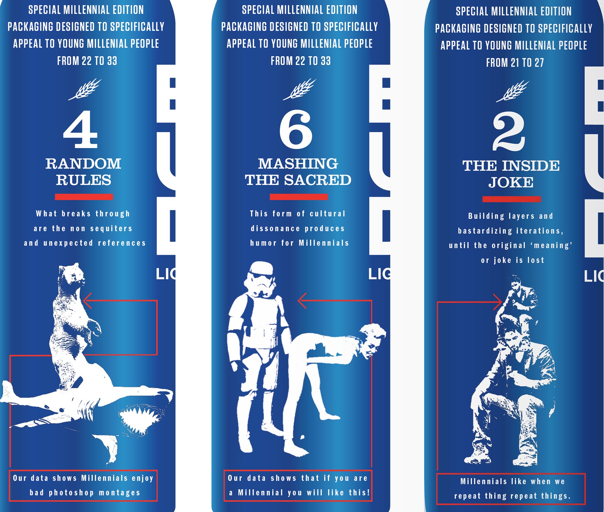 One idea that we showed and I loved was making "special millennial edition packaging designed to specifically appeal to young millennial people from 22 to 33 years old". Contains all eight "known forms" of humor our corporate research discovered they will enjoy: 1. Comedy as Currency. 2. Identifiably Different. 3. Mashing the Sacred. 4. Reality Redux. 5. Discoverable Niche. 6. Random Rules. 7. The Inside Joke. 8. Meta Awareness. Still believe this would be a hit.